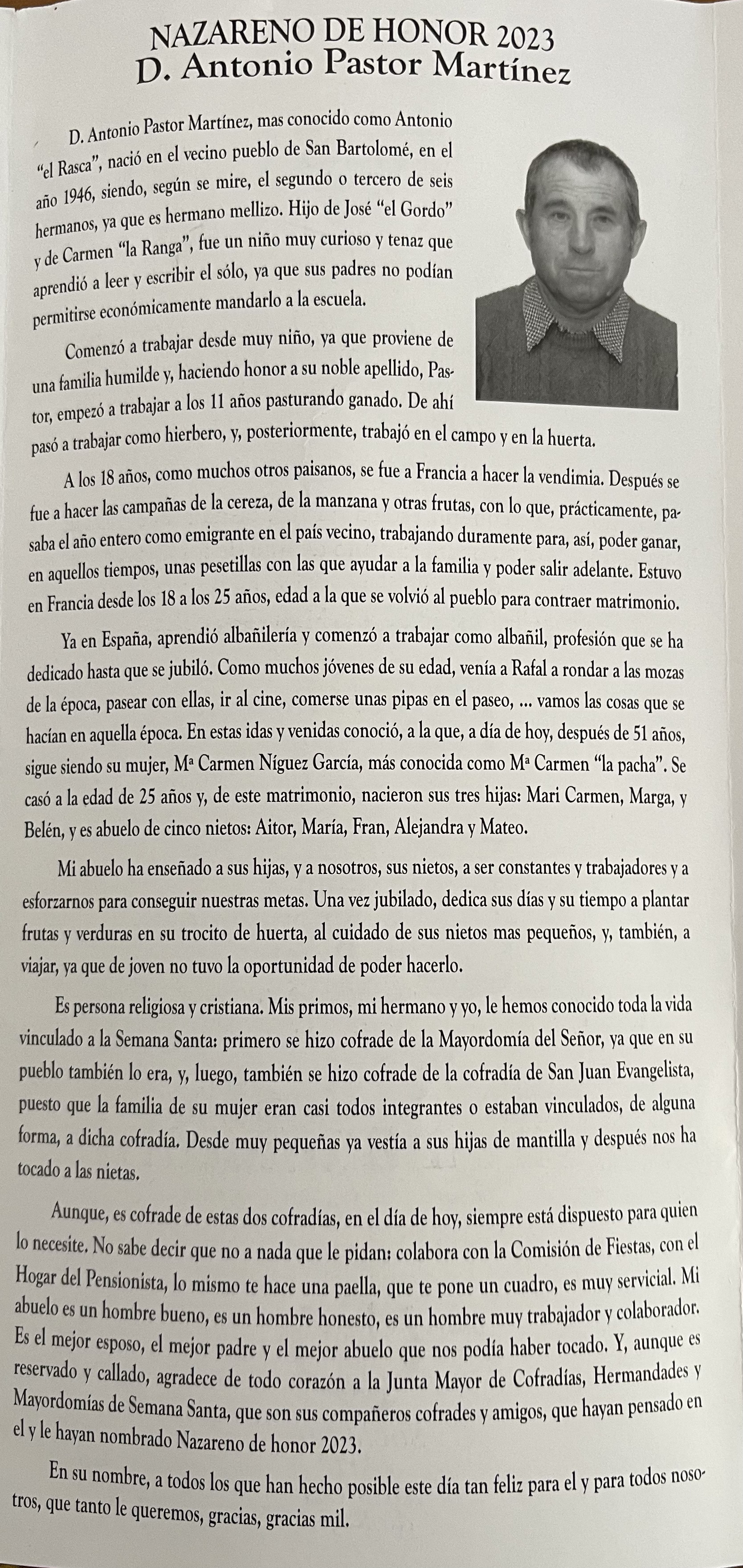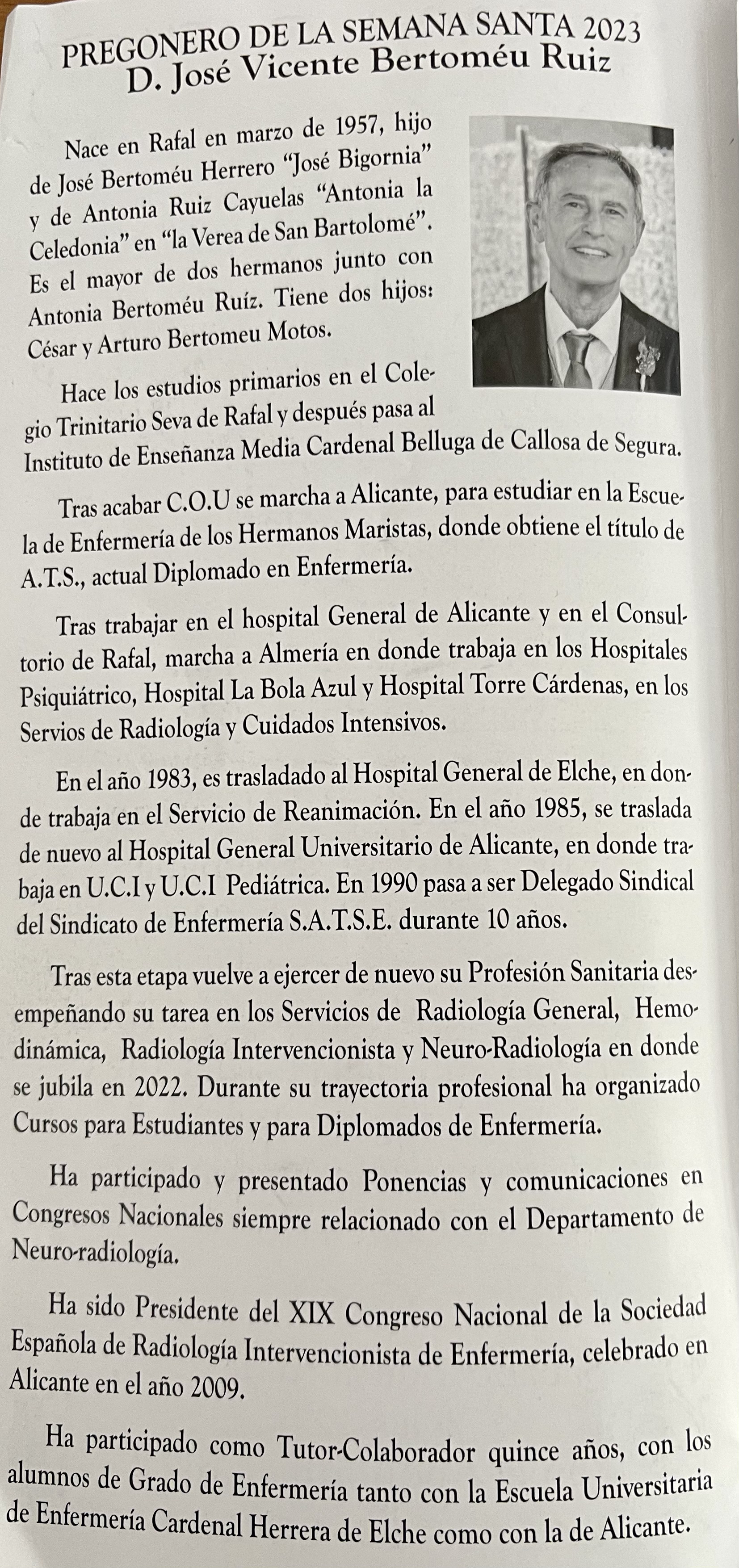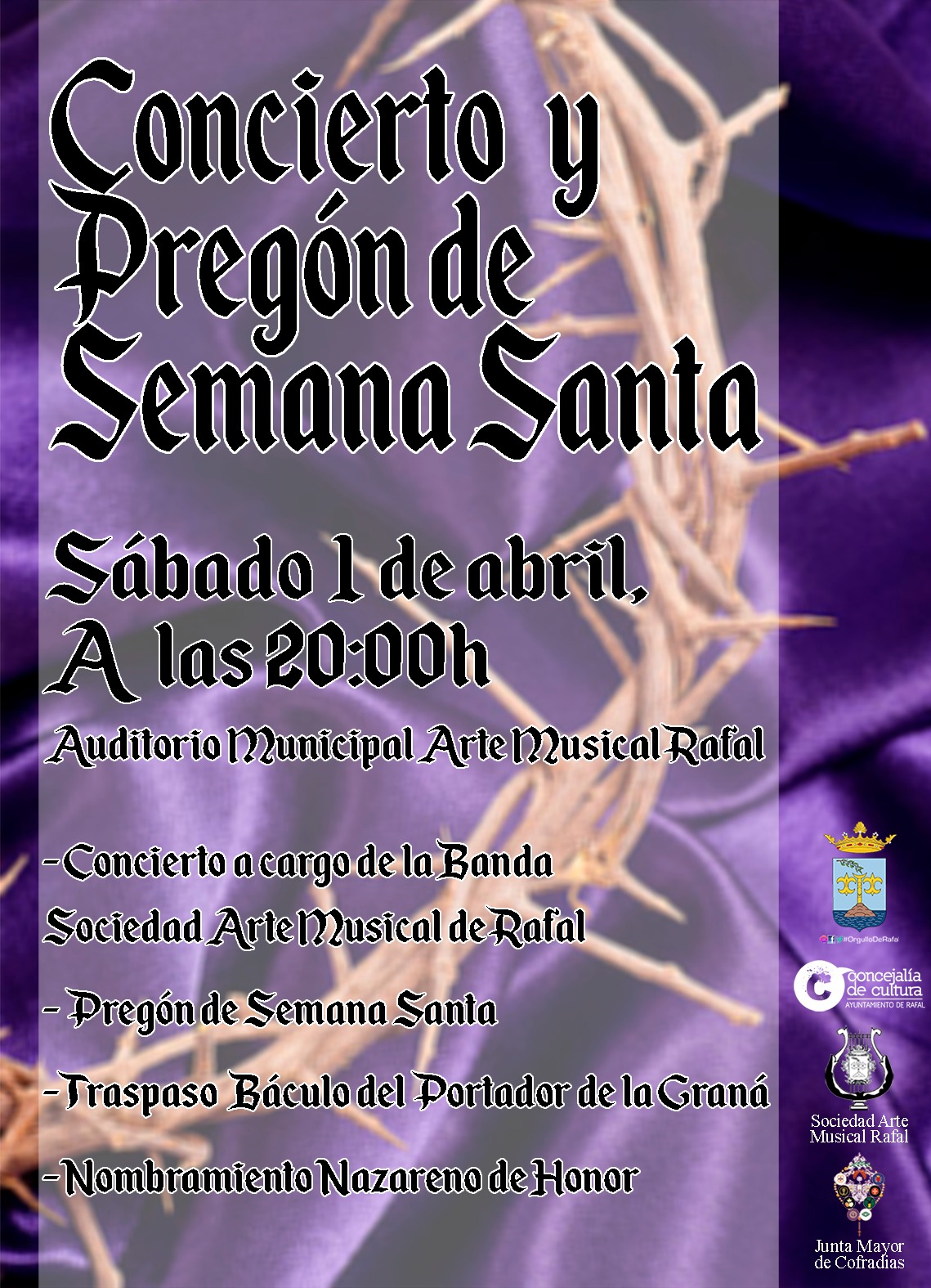 El sábado 1 de abril, víspera de Domingo de Ramos, D. José Vicente Bartomeu Ruiz glosa el pregón de la Semana Santa rafaleña, en el auditorio municipal a las 20 horas. A continuación se ofrecerá un concierto a cargo de la banda y coral "Arte Musical" de Rafal.